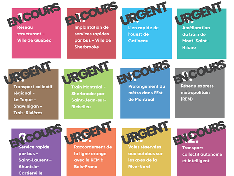 En août 2018, l’organisme Trajectoire Québec publiait les 12 travaux du transport collectif; 6 de ces 12 projets sont en cours de réalisation. Les projets en région semblent tarder à prendre leur envol, tandis que plusieurs projets urbains sont en cours de réalisation.